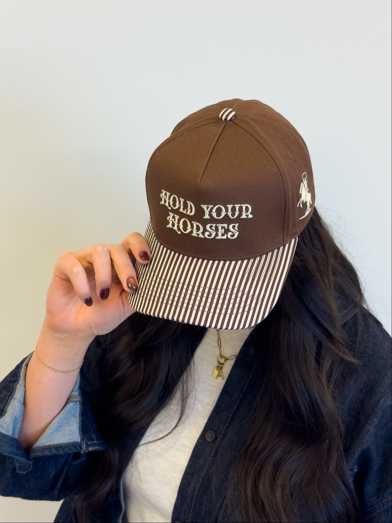 A little western, a little cheeky, and effortlessly wearable, the Hold Your Horses trucker hat is the perfect everyday accessory with personality. Designed with a rich brown crown and a cream-and-brown striped bill, this hat adds instant charm to any casual outfit. The raised embroidered lettering gives it that bold, vintage-inspired look that stands out in the best way.